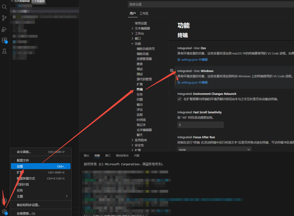 在 VSCode 中进入 设置,转到用户标签中的 功能 -> 终端 -> Env: Windows (也可以直接搜索:terminal.integrated.env.windows,然后点击 在 settings.json 中编辑,打开该文件: